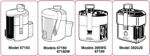 Unplug the juice extractor and turn it over. Check the bottom of the juice extractor for the model number (67150, 67180, 67180W, 395WS, 67199, 3920JS).