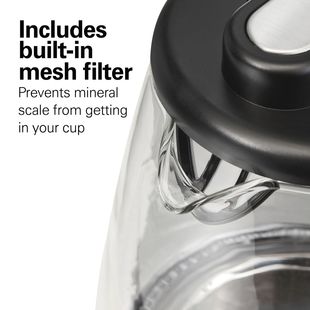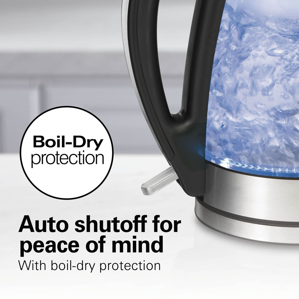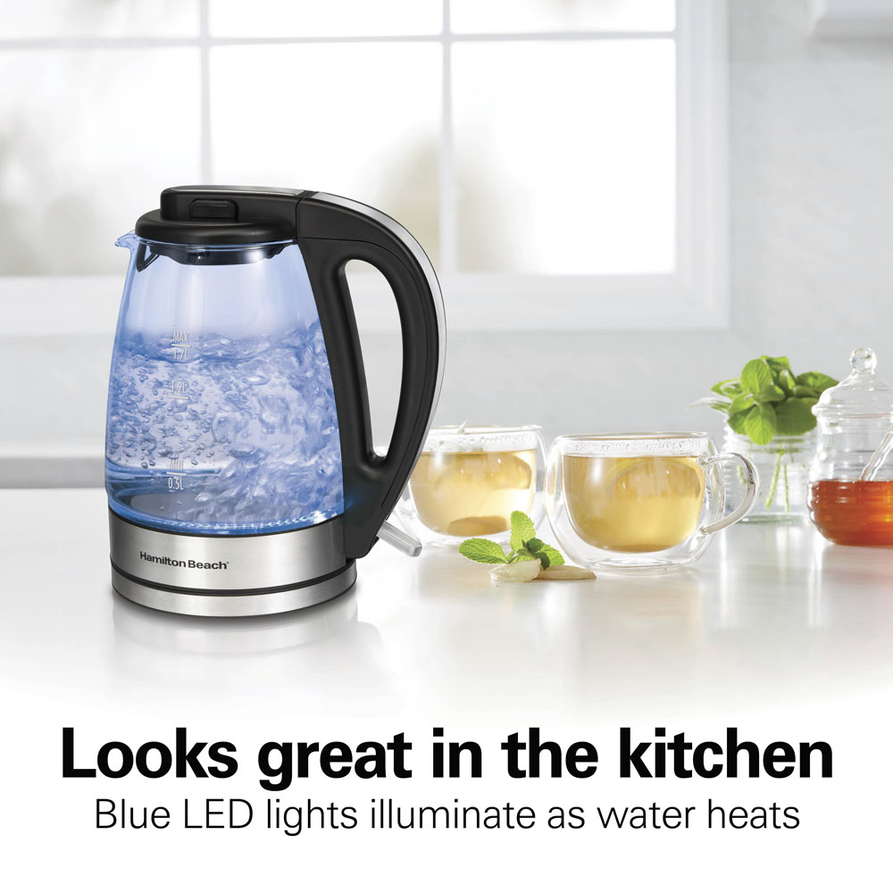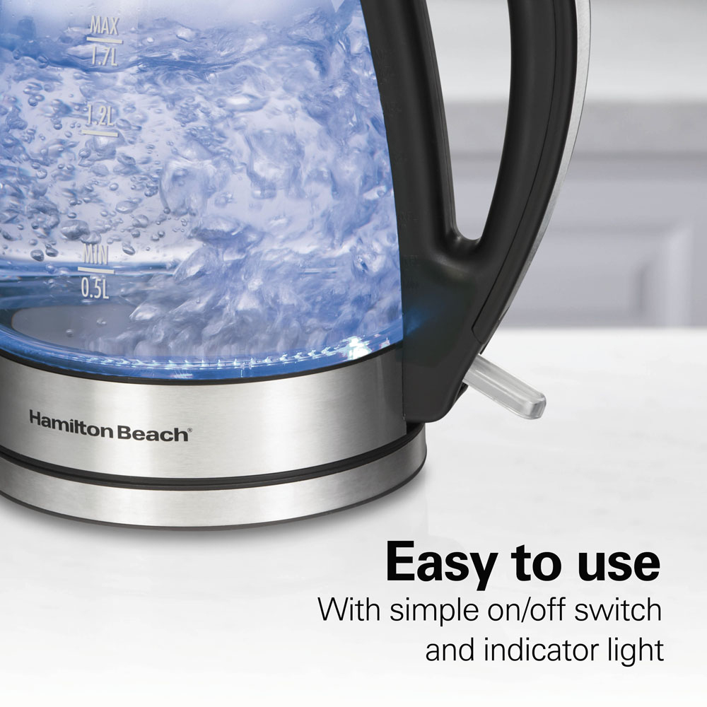 Heat water faster than in a microwave and safer than on a stovetop with the Hamilton Beach® Glass Electric Kettle. With a cord-free design and soft blue illumination, it quickly boils up to 1.7 liters of water for hot tea, soup, coffee and more. Speedy Results Meets Peace of Mind 1500 watts of power quickly boils water for tea, pour-over coffee and hot cocoa quicker than a microwave can do the job. Built-in safety features like automatic shutoff and boil-dry protection make it safer than boiling a kettle on the stovetop. Modern Flair and Function A soft blue light gently illuminates to let you know boiling water is on the way. Stainless steel accents and glass walls make this attractive kettle stand out on the countertop. 1.7 Liter Capacity The kettle’s 1.7 liter capacity means you can heat enough water for one cup of tea or a large batch of hot chocolate for the whole family. Cord-Free Convenience The kettle can be removed from its base and carried anywhere hot water is needed. Built-In Filter An anti-scale mesh filter around the lip of the kettle keeps water tasting its best while making cleaning easy. Hamilton Beach® products are thoughtfully designed to make your life easier. We use consumer insights, in-depth research and rigorous testing to deliver the best solution to your everyday needs. Whether it's preparing delicious meals and beverages effortlessly, or making your clothes look their best, you can count on the brand that has spent over 100 years creating products with you in mind.