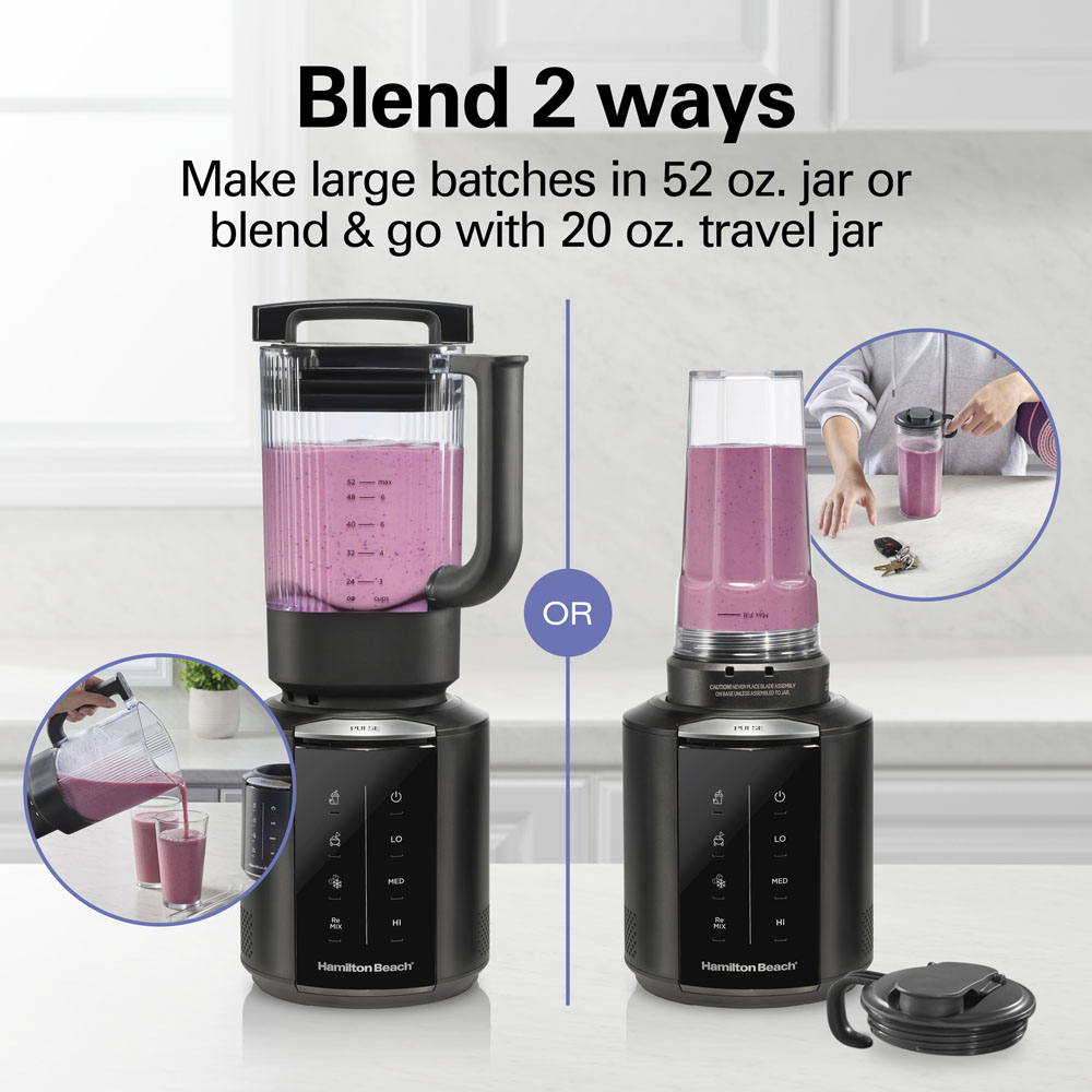 Powered by a 1200 watt peak-power motor, the MaxCrush™ stainless steel blades spin 3 times faster with 6 optimized points of interaction. Crush ice into snow in seconds, liquify fruit and pulverize the hardest vegetables — MaxCrush blades handle every ingredient with ease. The Blend & Store System includes everything you need to blend at home or on-the-go. In addition to the 52 oz. jar for blending larger batches and the innovative FreshPress Lid, it also includes a 20 oz travel jar for blending single servings and a sip-through lid. Give your kitchen more blending innovation, power and convenience with the Blend & Store System by Hamilton Beach. The power to crush, the technology to preserve.™