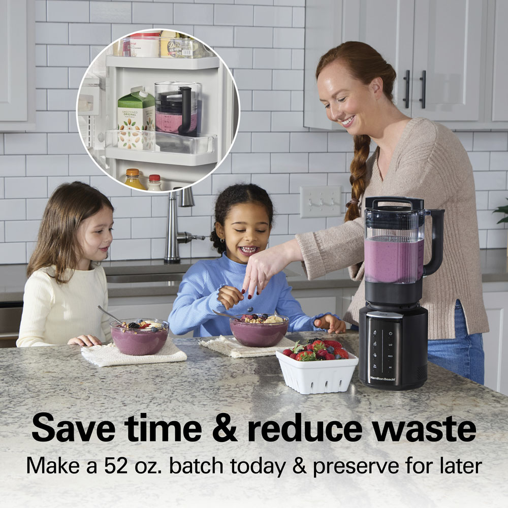Lock in the freshness for up to 3 days with the FreshPress lid that comes with this Hamilton Beach blender. Simply push the FreshPress lid down after blending in the 52 oz. jar and store in your refrigerator.
