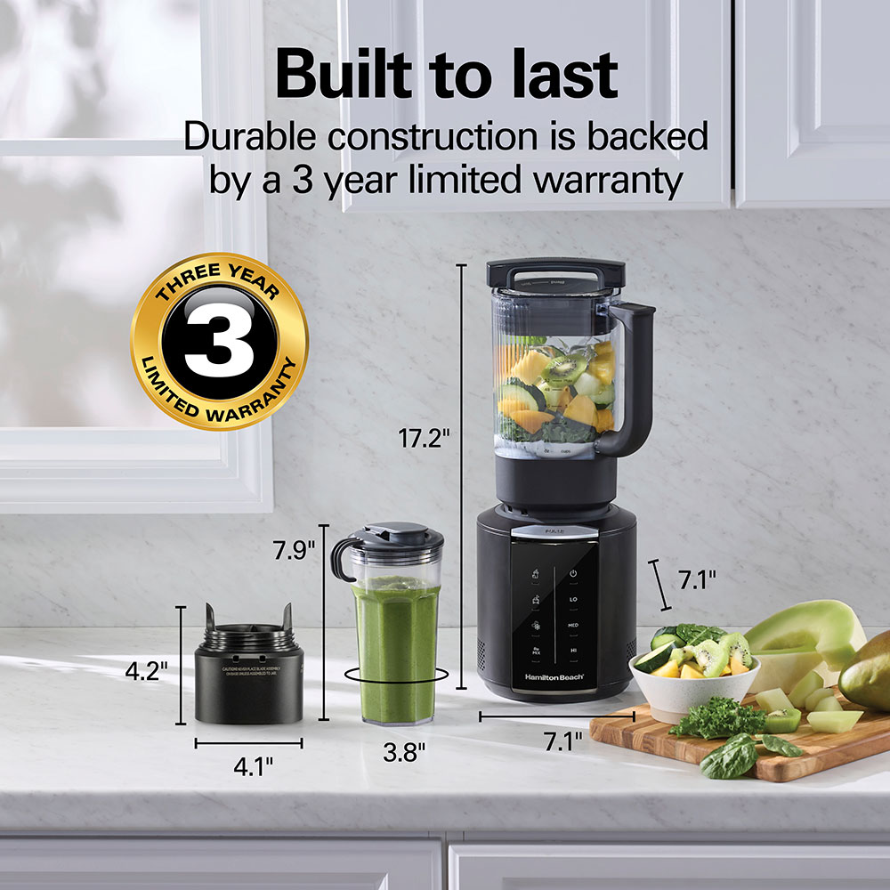This kitchen blender is built for long-lasting performance from top to bottom and comes with a 3 year limited warranty by Hamilton Beach.