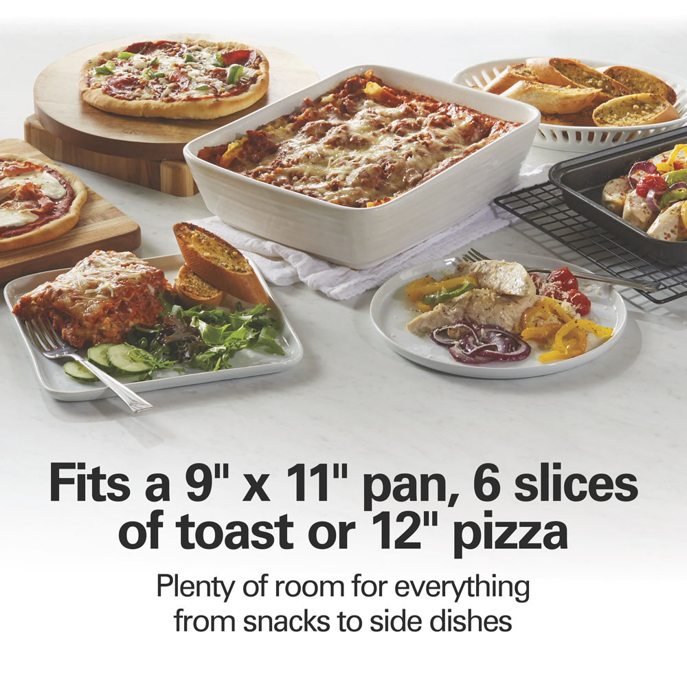 Fits a 9" x 11" bake pan, 6 slices of toast or a 12" pizza