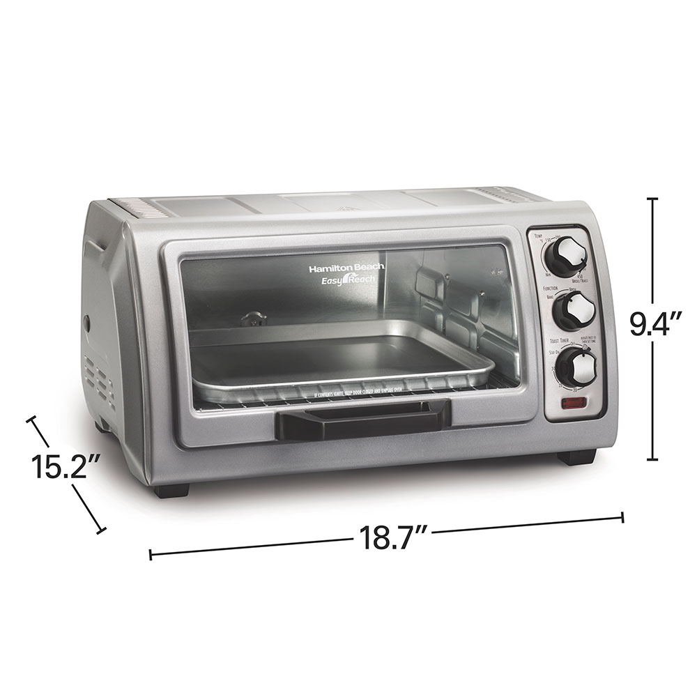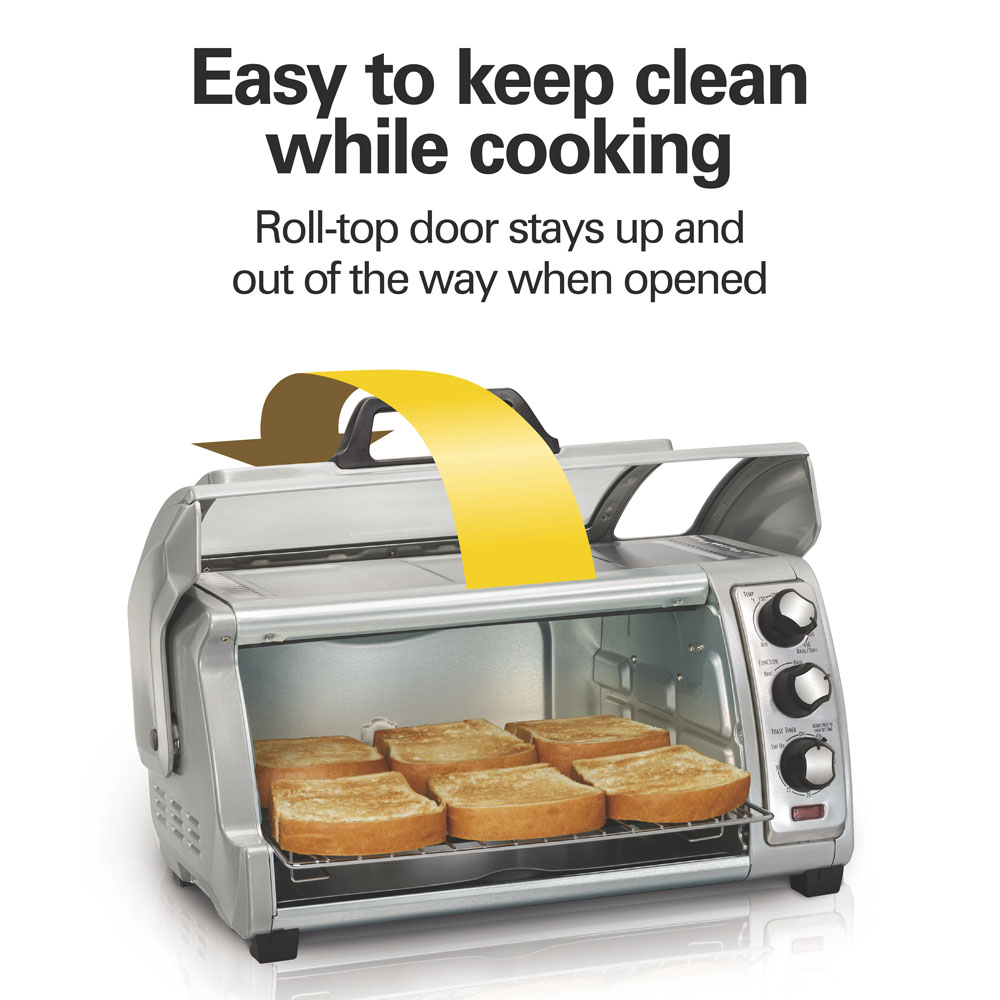 The Hamilton Beach® Easy Reach® Toaster Oven has a door that rolls up and stays out of the way to give you easy access to the oven without blocking your countertop. Because it stays up and out the way of drips and spills, the door doesn't get as messy as traditional toaster oven doors. This toaster oven is the ideal size for everything from snacks to side dishes. It has a spacious interior that fits a 9" x 11" bake pan, 6 slices of toast or a 12" pizza.