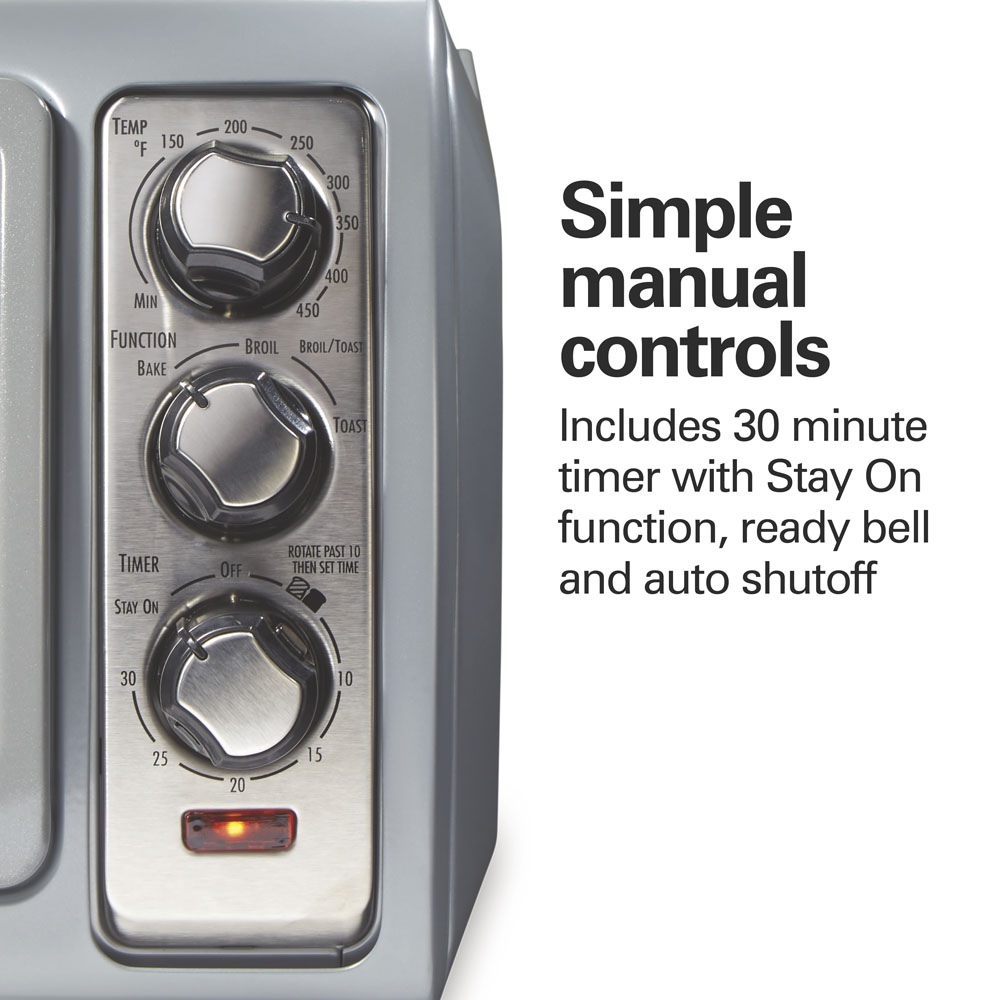 This toaster oven has manual controls that are easy to use. Great for anyone who wants a toaster oven that gets the job done without being complicated. Includes 30 minute timer with Stay On function, ready bell and auto shutoff.