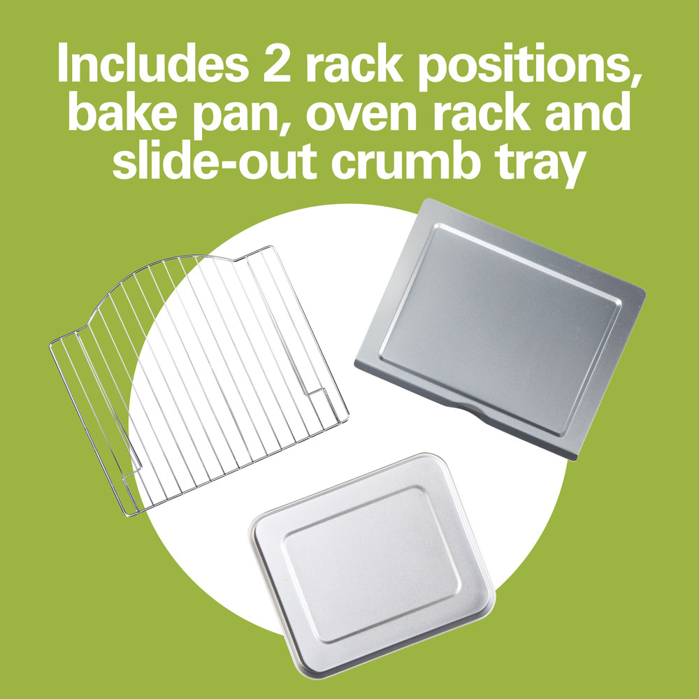The toaster oven gives you the versatility to cook 3 ways — bake, broil or toast. It has 2 rack positions, 1400 watts of power and a wide temperature range of 150 to 450º F. It's great for everything from heating up leftovers to broiling chicken breasts and making toast. The toaster oven has simple manual controls that are easy to use. It has a 30 minute timer with Stay On function, a ready bell that rings when the cooking cycle is complete and auto shutoff. The toaster oven includes a bake pan, oven rack and a slide-out crumb tray for cleaning.