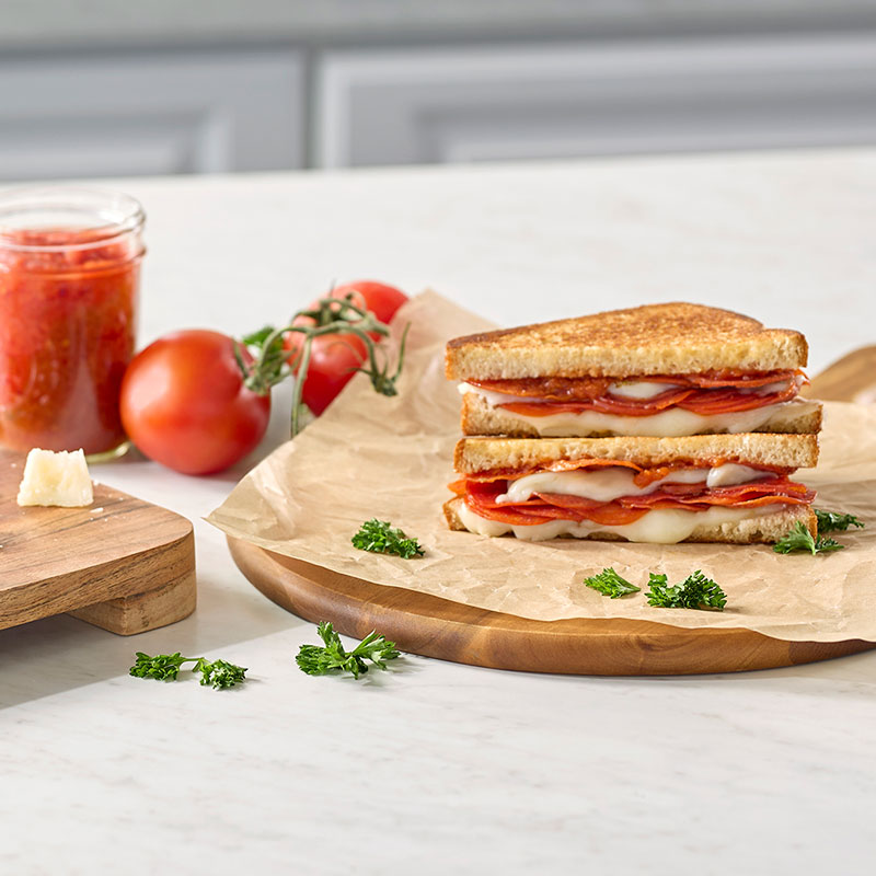 Place one slice of bread, buttered side down, in bottom ring of Sandwich Stacker. Add mozzarella cheese and ½ of pepperoni.