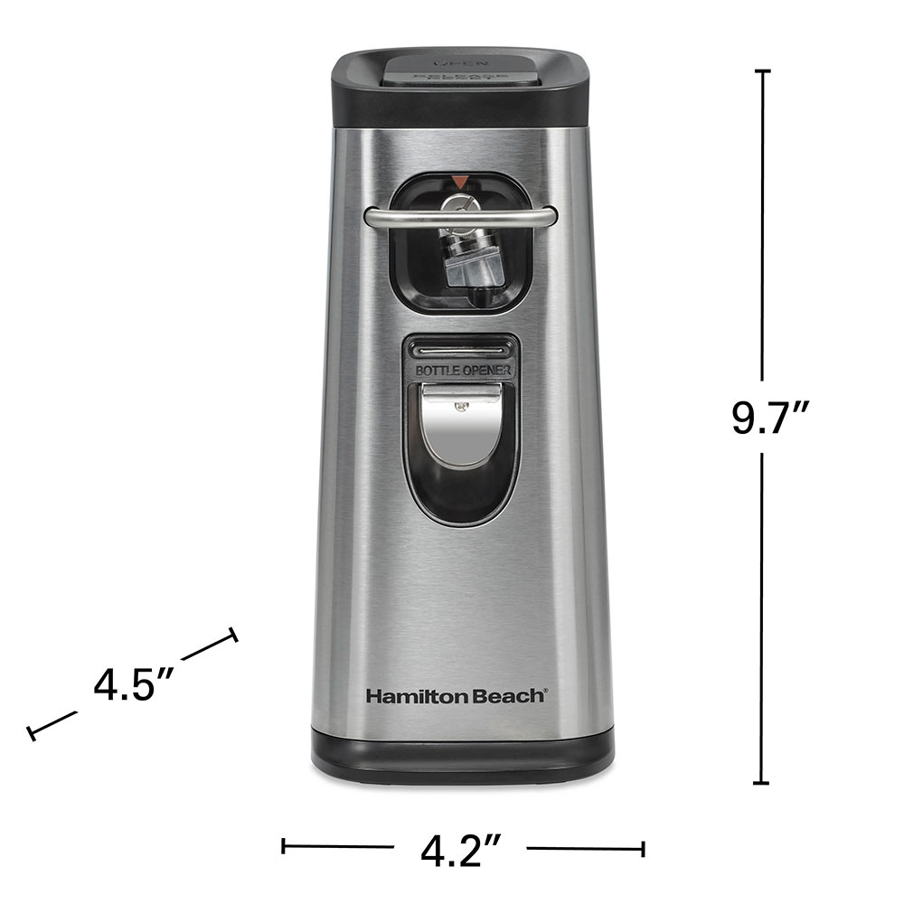 The Hamilton Beach® Smooth Touch™ Electric Can Opener cuts along the sides of cans, eliminating sharp lid edges, leaving you with smooth, touchable lids. This extra-tall can opener easily opens a wide variety of different-sized cans including taller cans. It opens both pop-top and regular cans with ease. The push-down lever makes it simple to align and open cans with one smooth action. Once the can opener starts cutting, it opens and holds the can in place until the release button is pressed for convenient one-handed operation.
