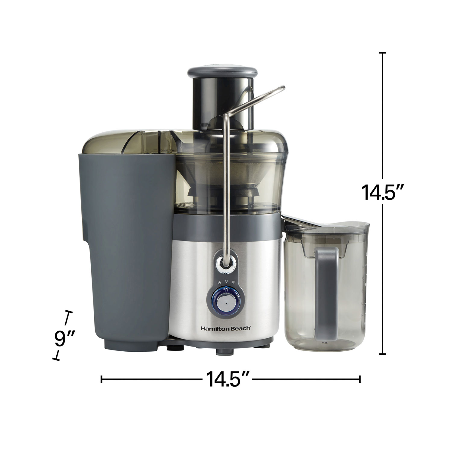 Enjoying fresh, healthy juice has never been easier. With its extra-large 3 inch chute, 850 watt motor and dual speeds, the Hamilton Beach Big Mouth® Easy Clean Juice Extractor quickly transforms whole fruits and vegetables into smooth, nutritious juice in seconds. The powerful dual-speed motor ensures maximum juice yield from hard and soft produce without clogging. High speed is great for apples, carrots and beets, and the low speed works well for leafy greens, grapes and tomatoes. The 3 inch Big Mouth® chute lets you easily add whole foods to save time and effort in the kitchen. Fit whole apples, peeled oranges, or handfuls of kale. The juicer's drip-free spout flips up to prevent drips in between batches for less mess. The large 40 oz. BPA-free pitcher with lid and froth separator keeps juice neatly contained and strains off the foaming froth when pouring juice. The juicer is easy to clean with a patented Easy Sweep™ Cleaning Tool that sweeps away pulp to cut strainer cleaning time in half. The pulp bin, juice bowl, lid and pusher are all dishwasher safe. The juice extractor is backed by Hamilton Beach, America's #1 juice extractor brand,* with a 3 year limited warranty.