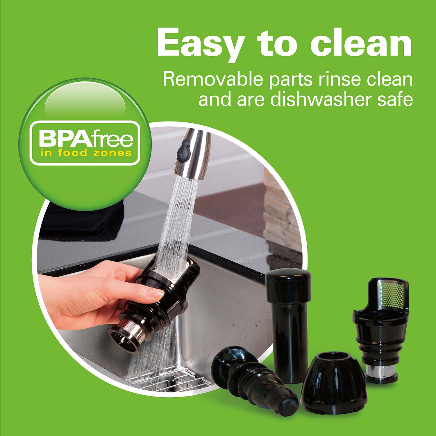 Cleaning up after you juice is easy. The parts on the masticating juicer easily rinse clean with no scrubbing required. The juicer comes with a convenient strainer cleaning brush and dishwasher safe pulp bin, juice bowl, lid and pusher.